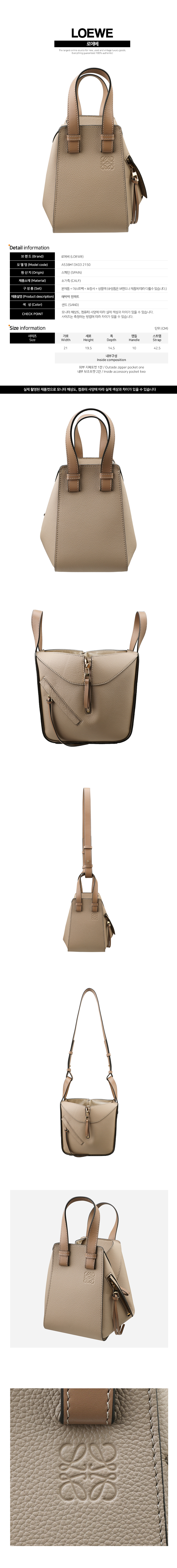 | 크기 | 가로 21cm 세로 19.5cm 폭 14.5cm 핸들 10cm 스트랩 42.5cm (외부 지퍼포켓 1칸 / 내부 보조포켓 2칸) |