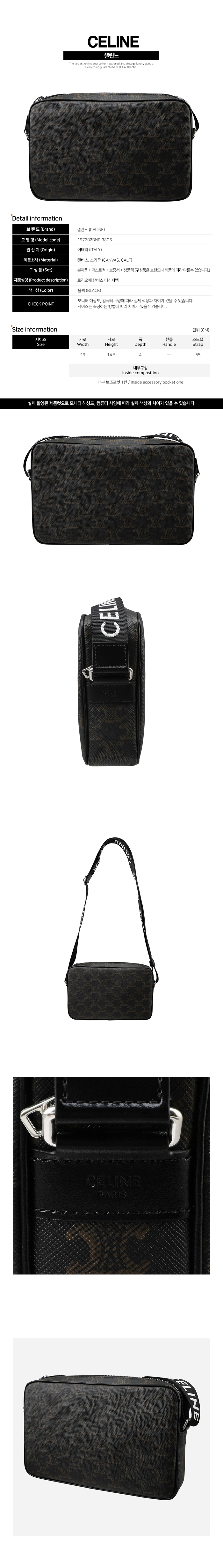 | 크기 | 가로 23cm 세로 14.5cm 폭 4cm 스트랩 55cm (내부 보조포켓 1칸) |