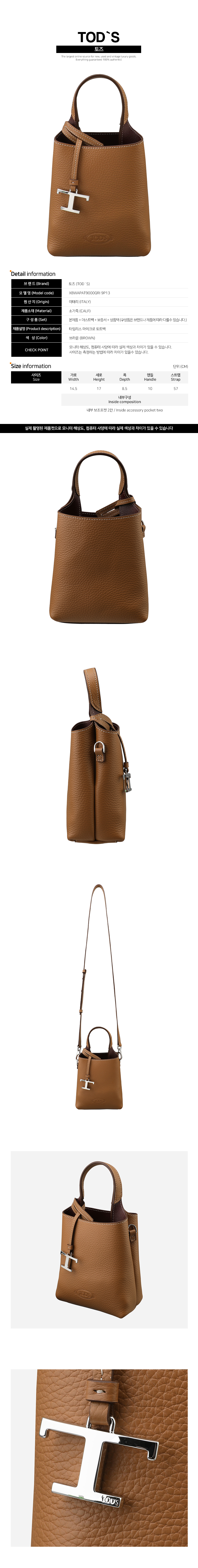 크기 가로 14.5cm 세로 17cm 폭 8.5cm 핸들 10cm 스트랩 57cm (내부 보조포켓 2칸)