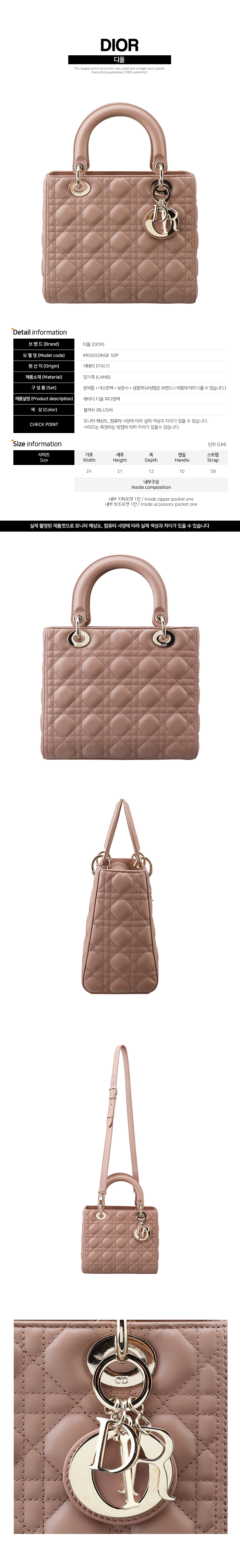 크기 가로 24cm 세로 21cm 폭 12cm 핸들 10cm 스트랩 59cm (내부 제퍼포켓 1칸 / 내부 보조포켓 1칸)